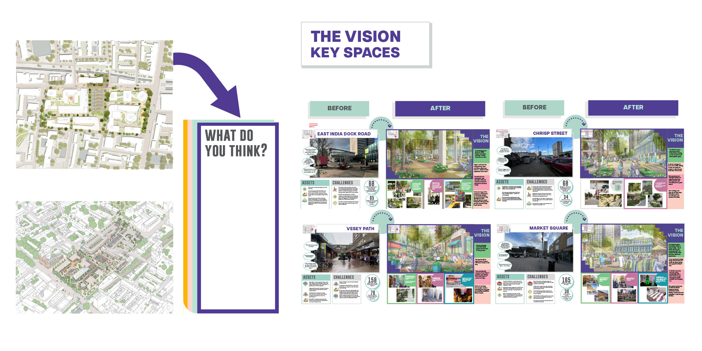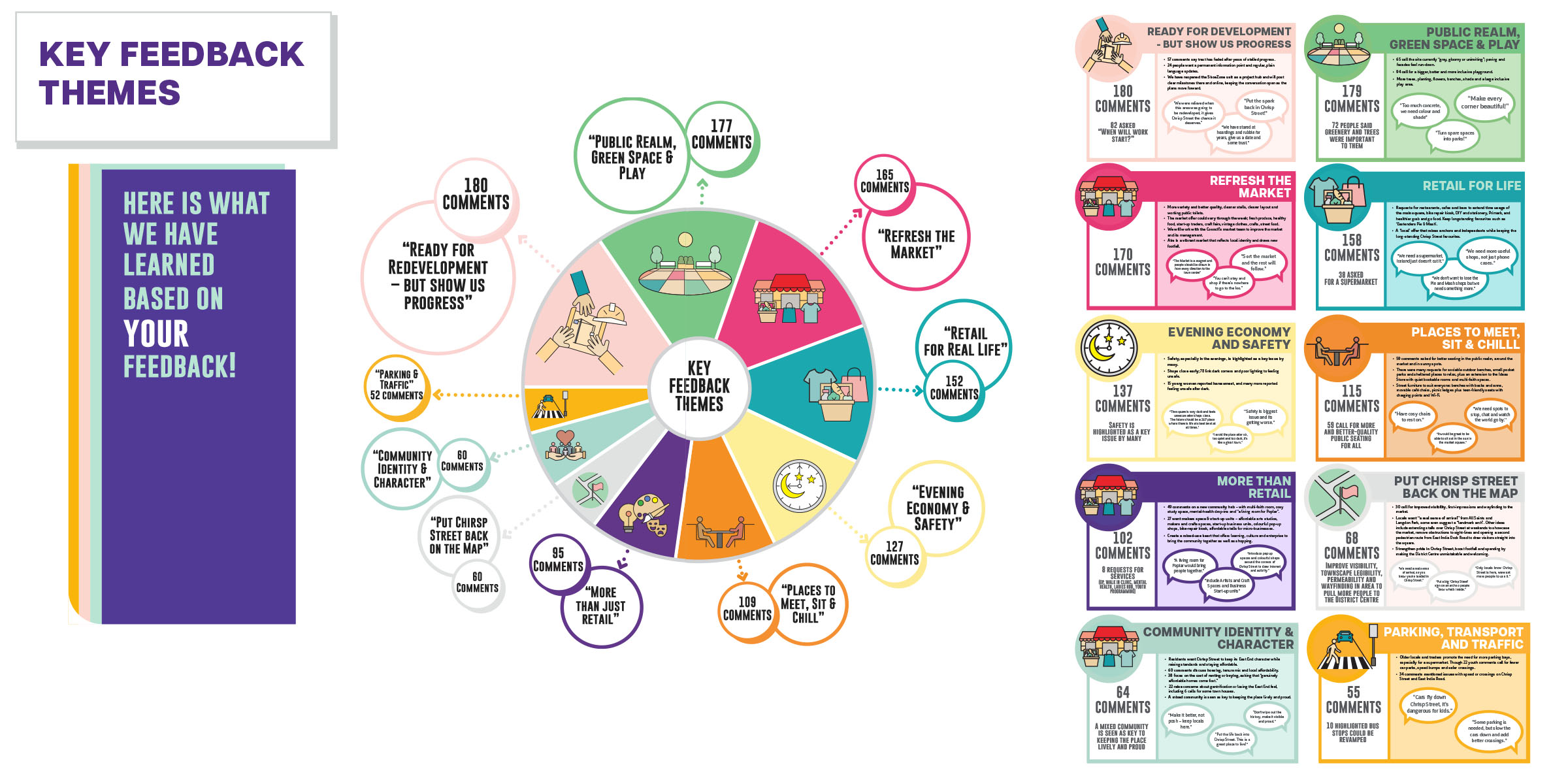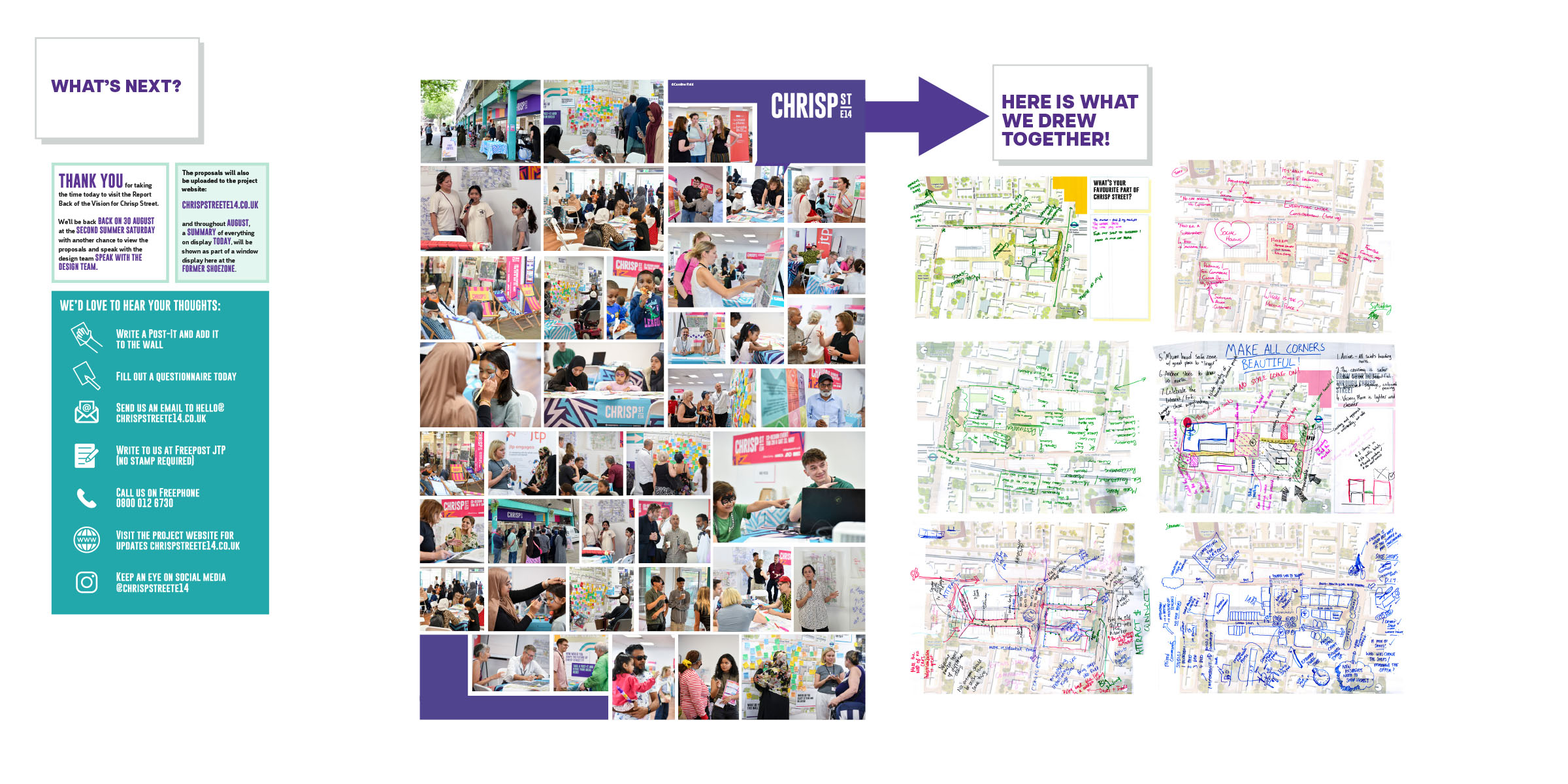 Following the co-design event, the JTP team analysed and summarised the outcomes to draw up an illustrated vision for Chrisp Street which was reported back at the Summer Saturday events on 26 July 2025 and 30 August 2025.