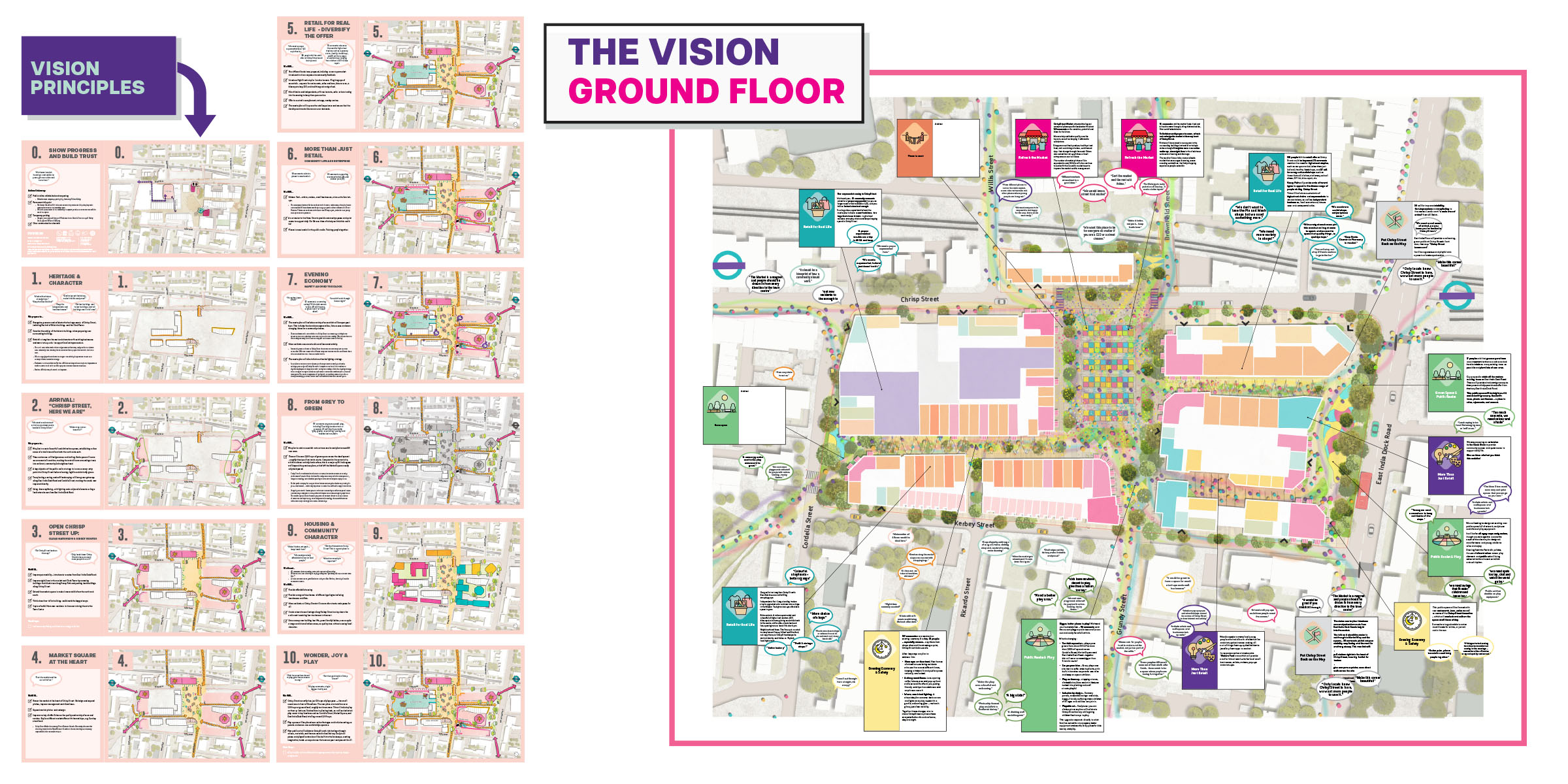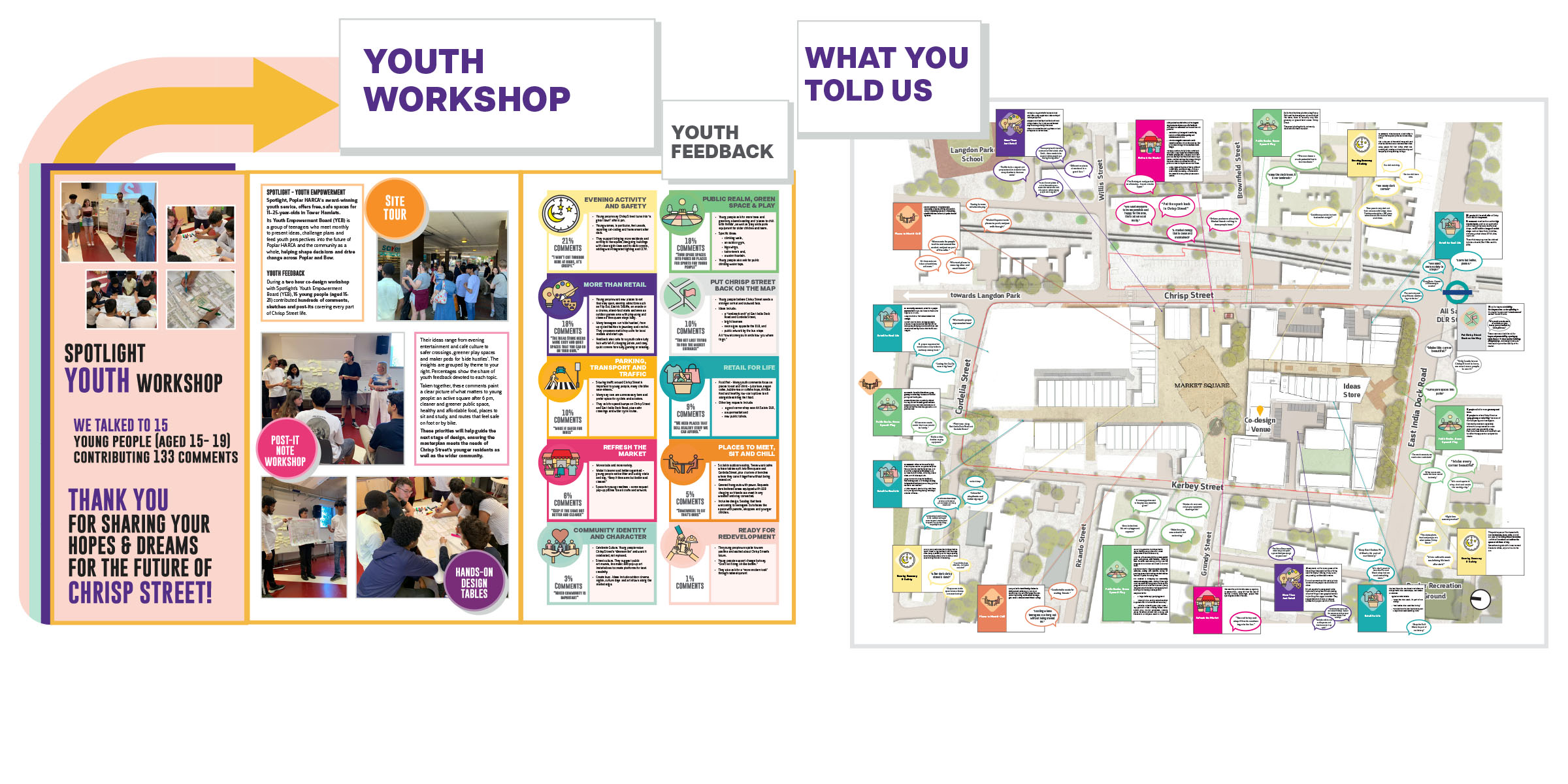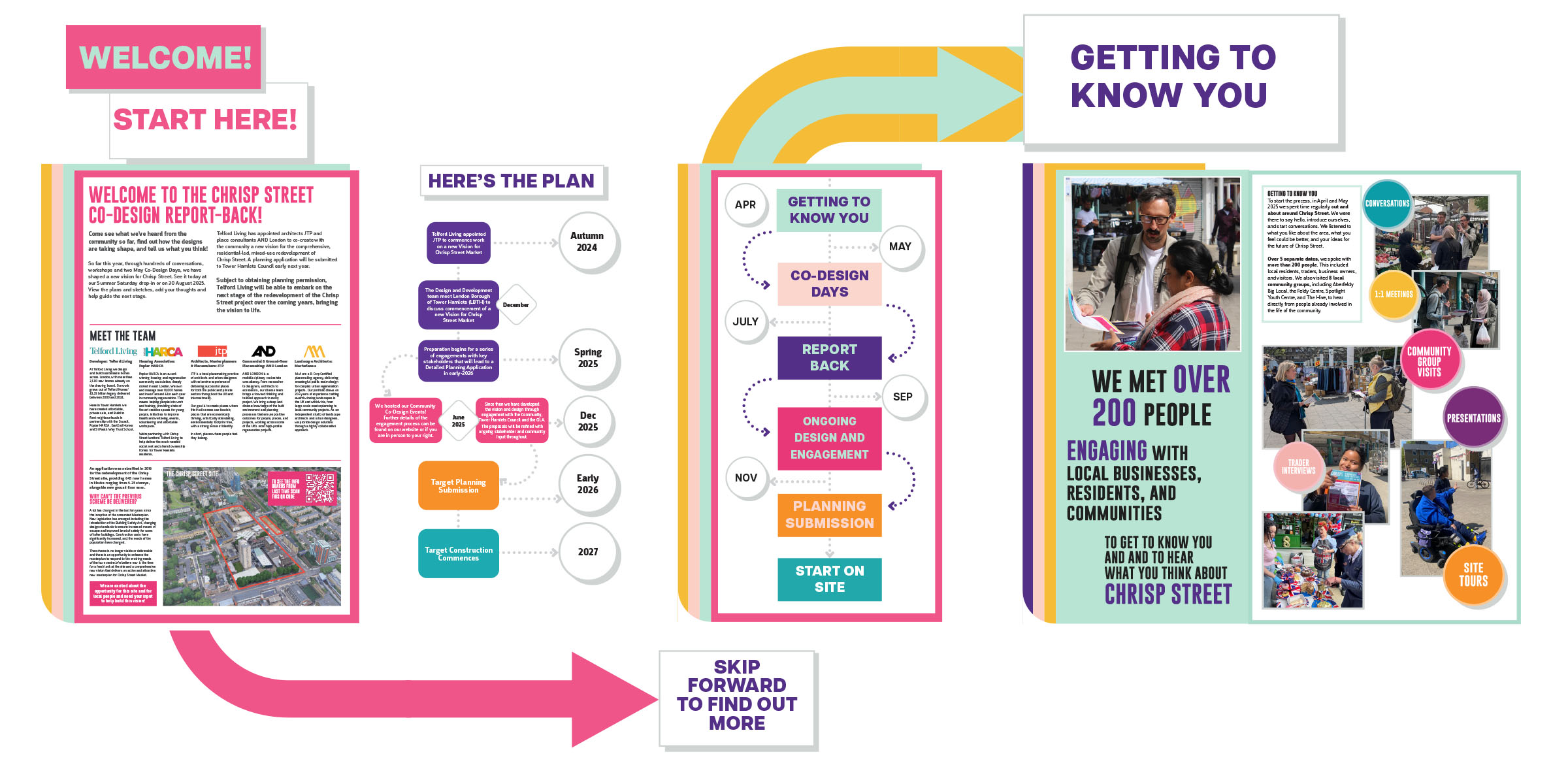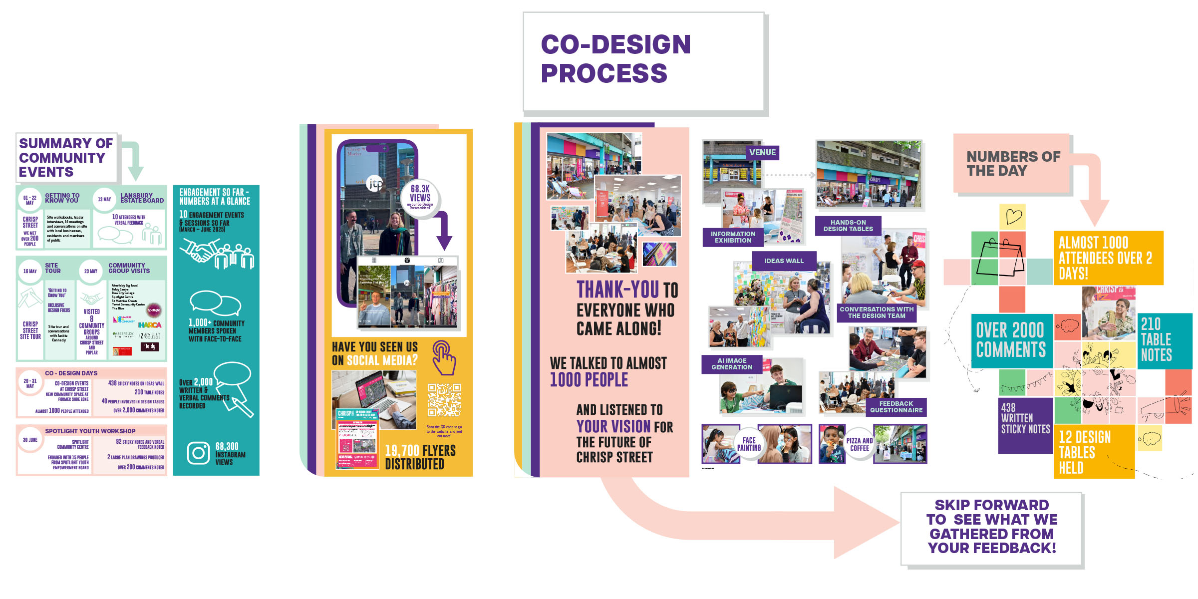 Following the co-design event, the JTP team analysed and summarised the outcomes to draw up an illustrated vision for Chrisp Street which was reported back at the Summer Saturday events on 26 July 2025 and 30 August 2025.